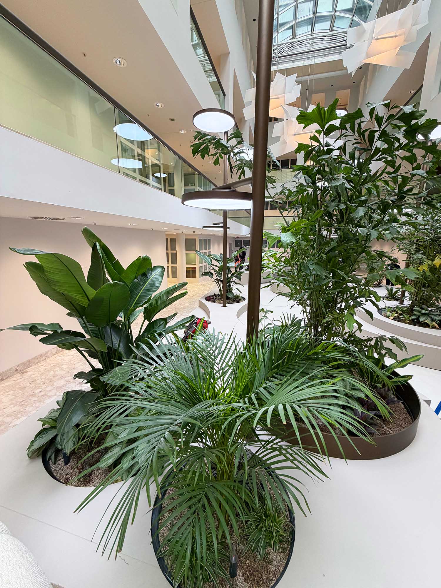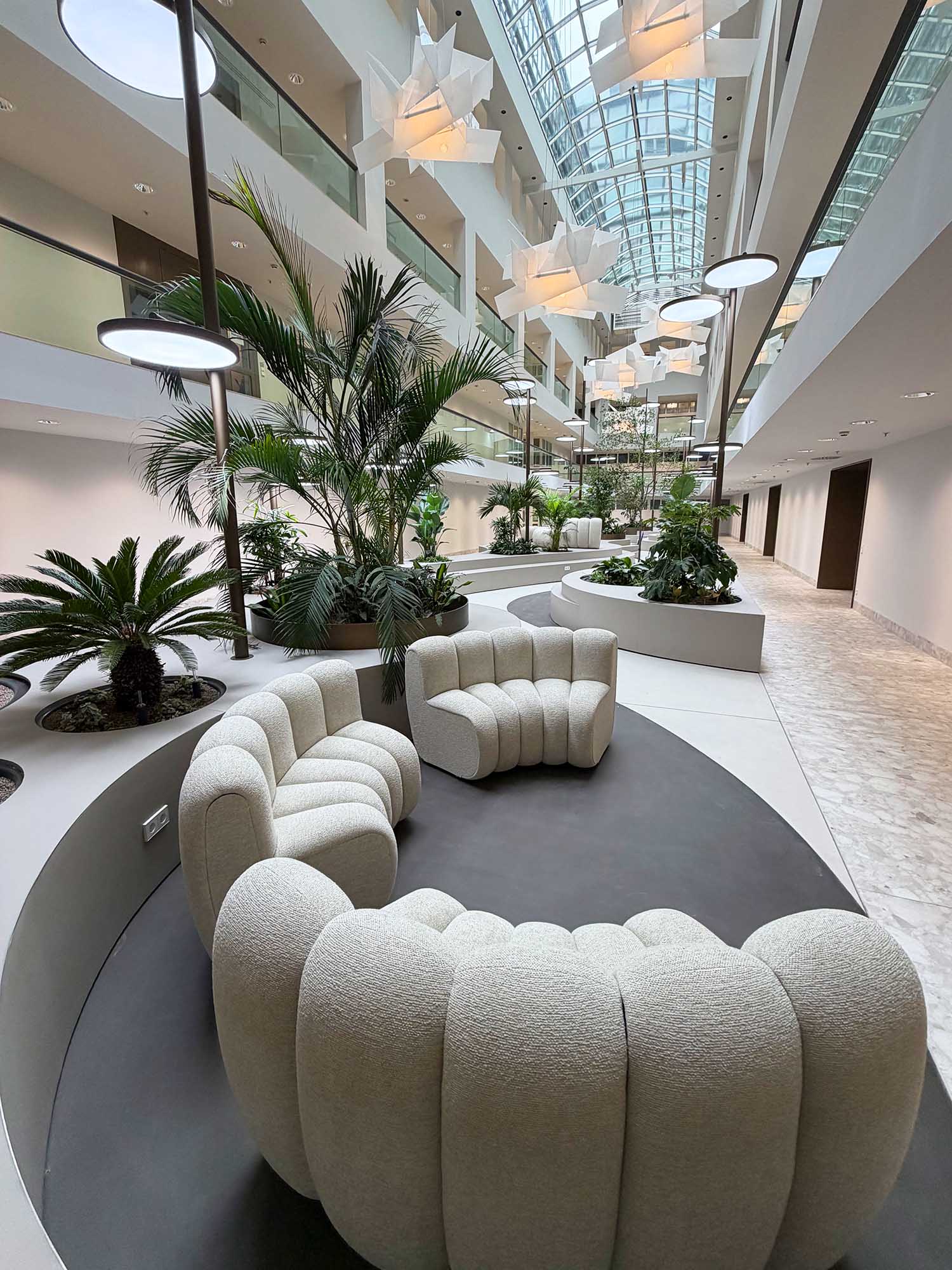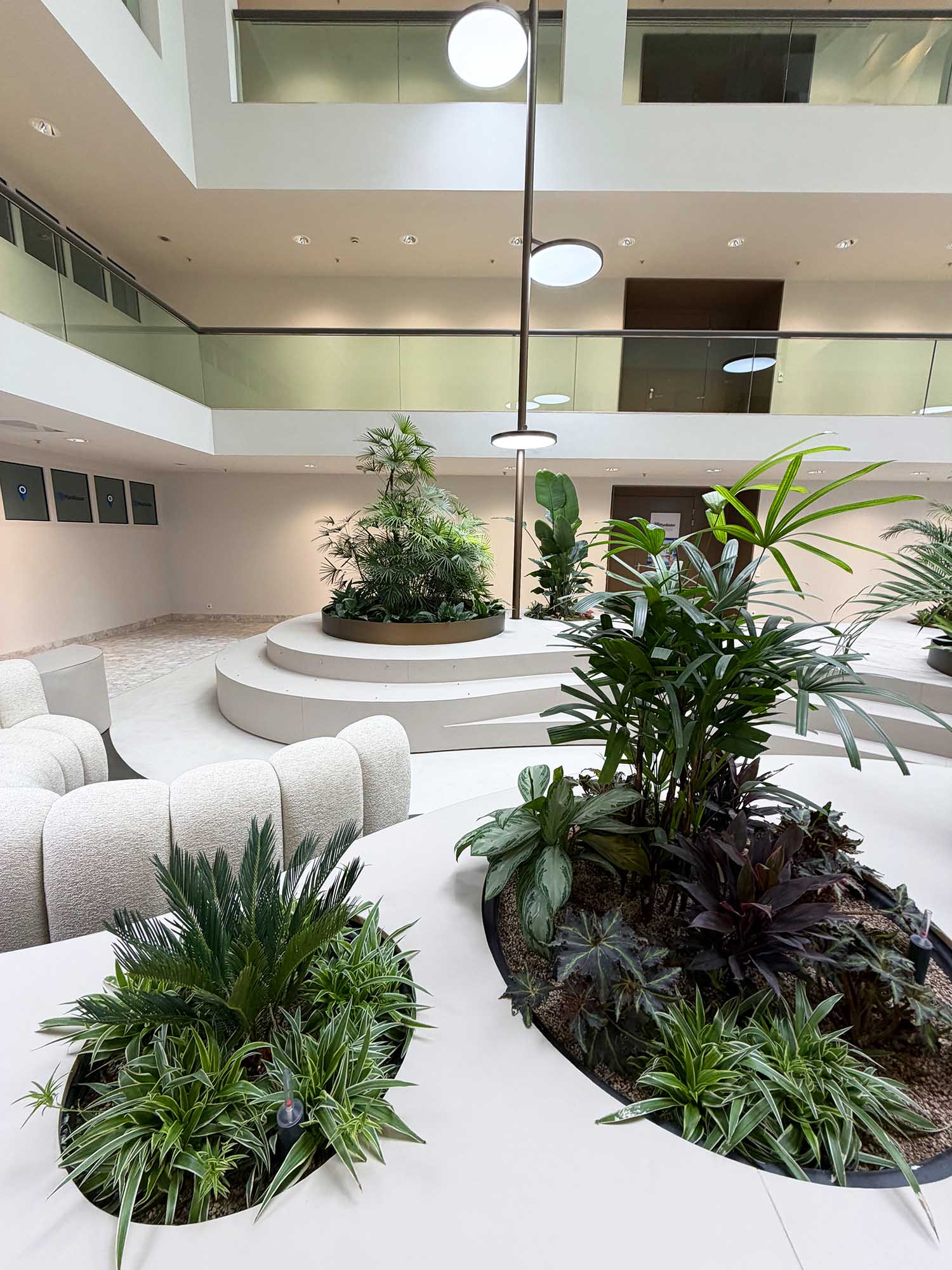 Eine grüne Oase mitten im Bürogebäude bietet einen erfrischenden Raum zum Entspannen, Plaudern und Zusammenarbeiten.