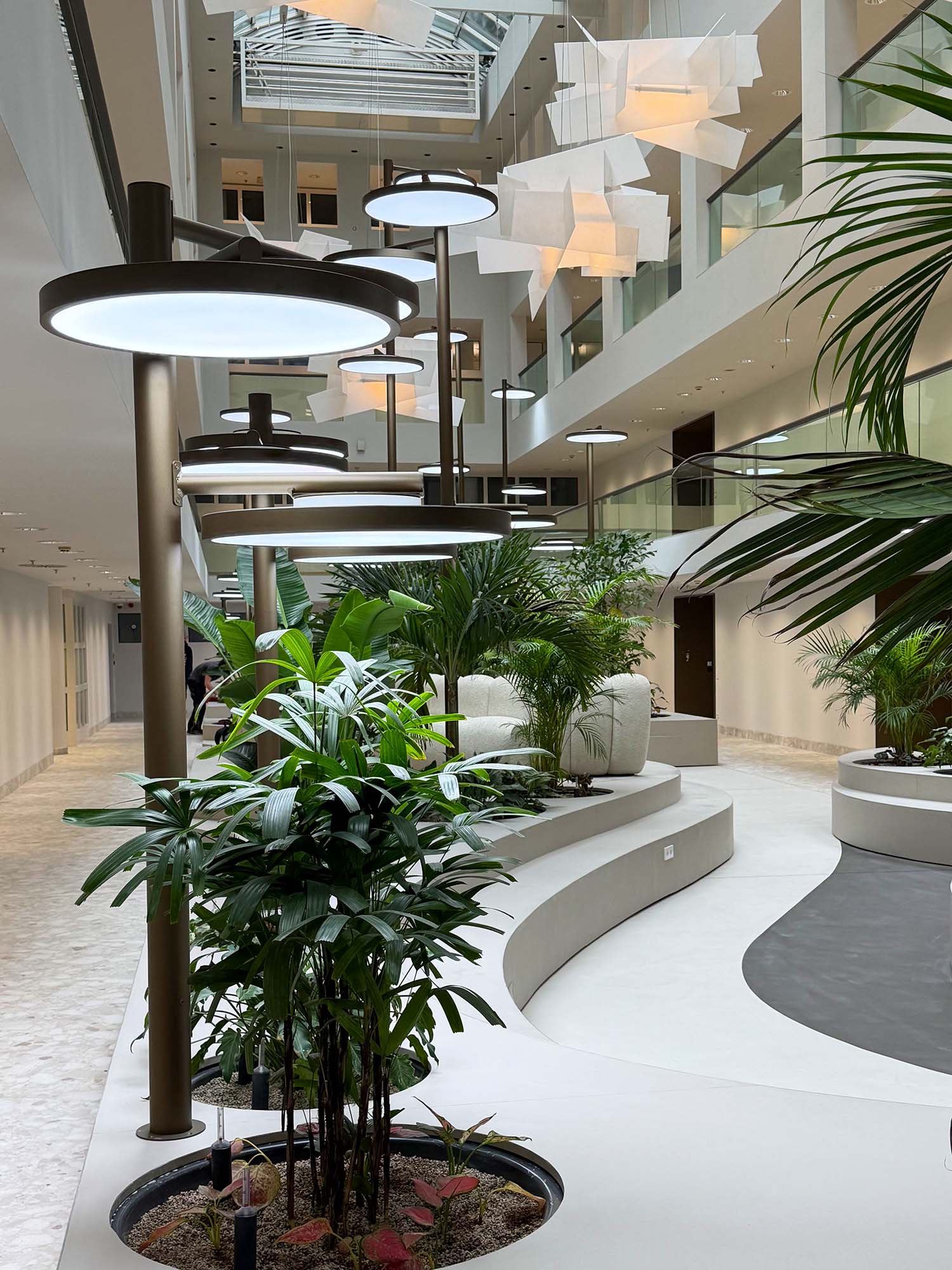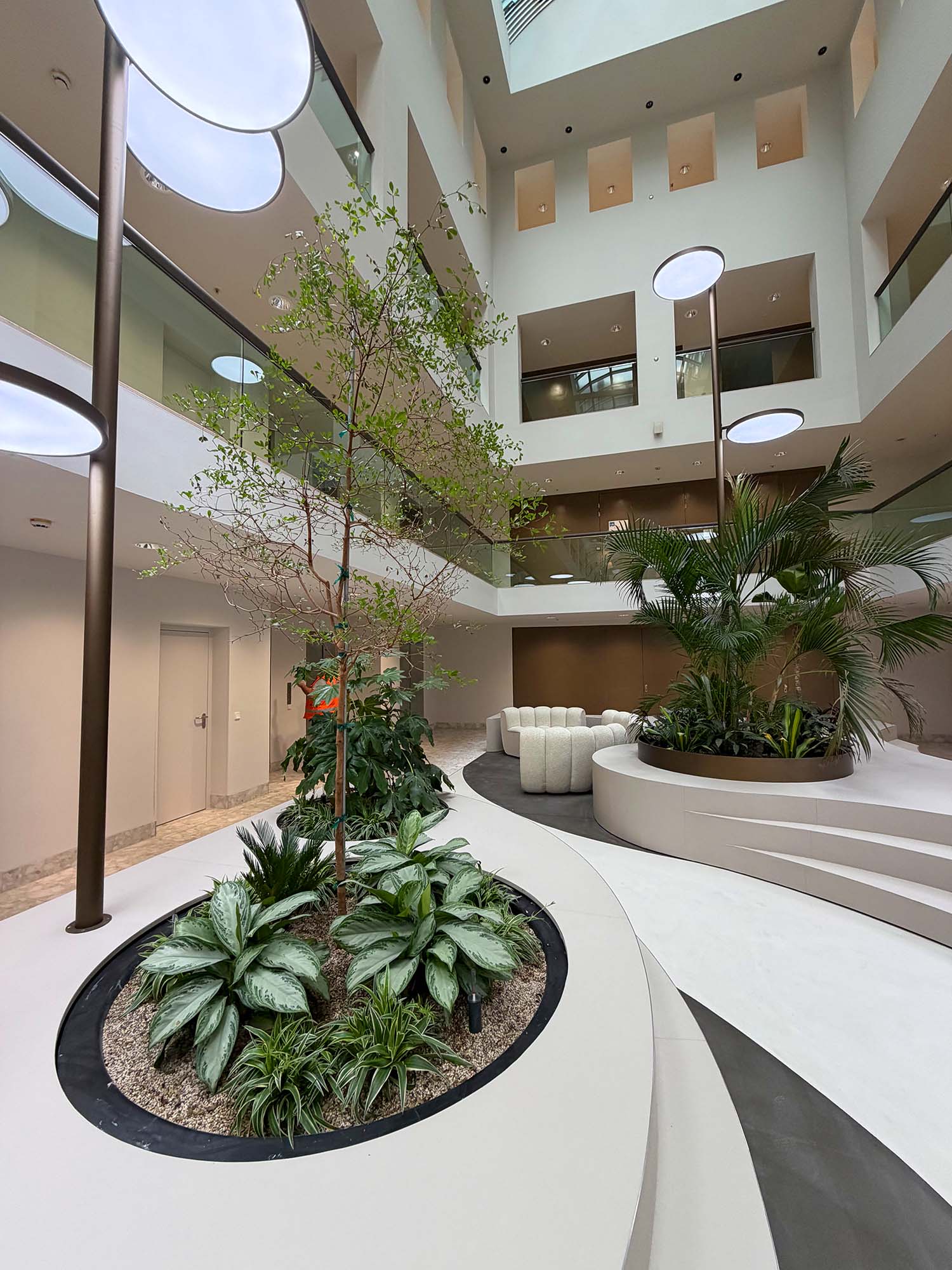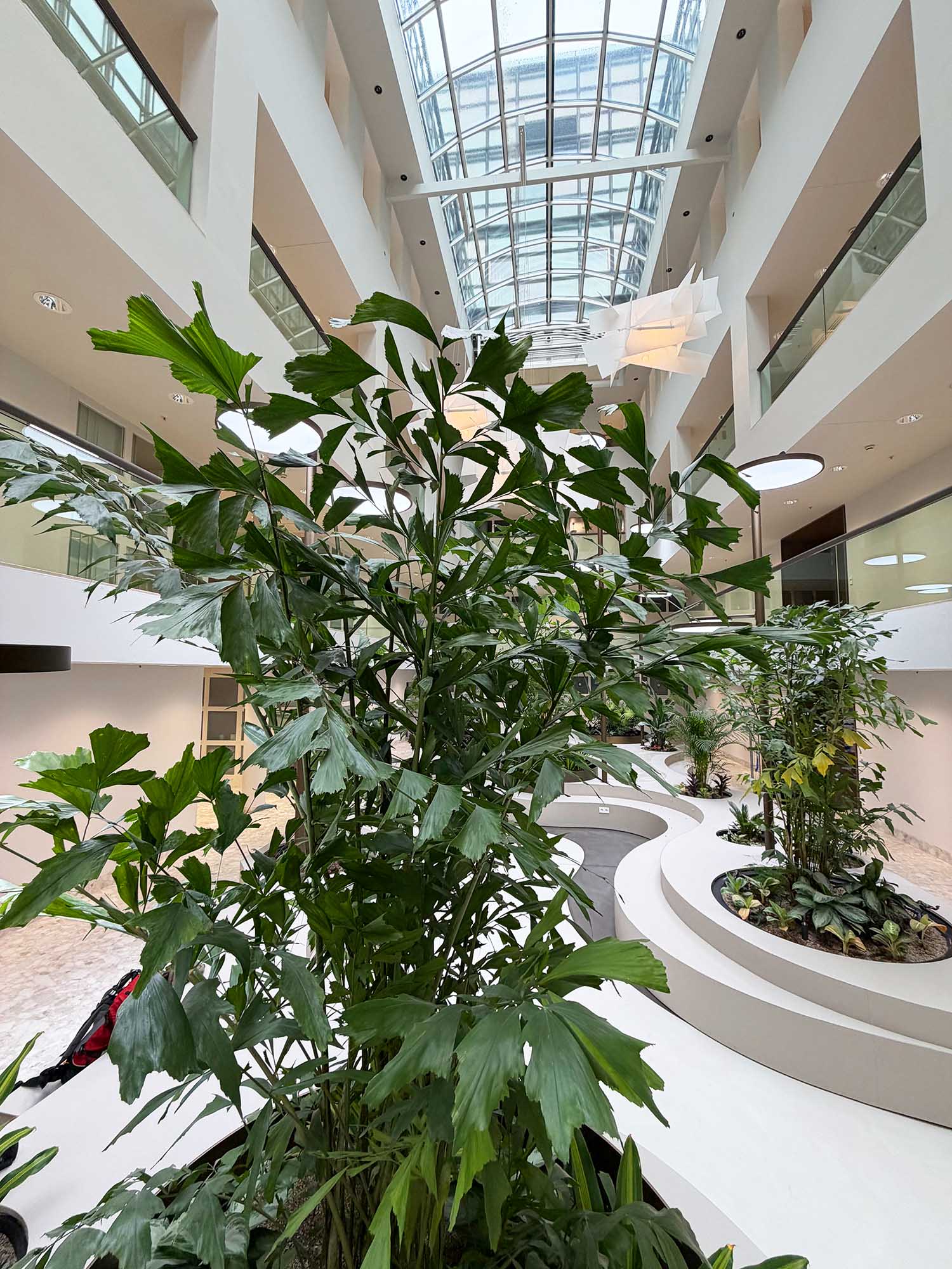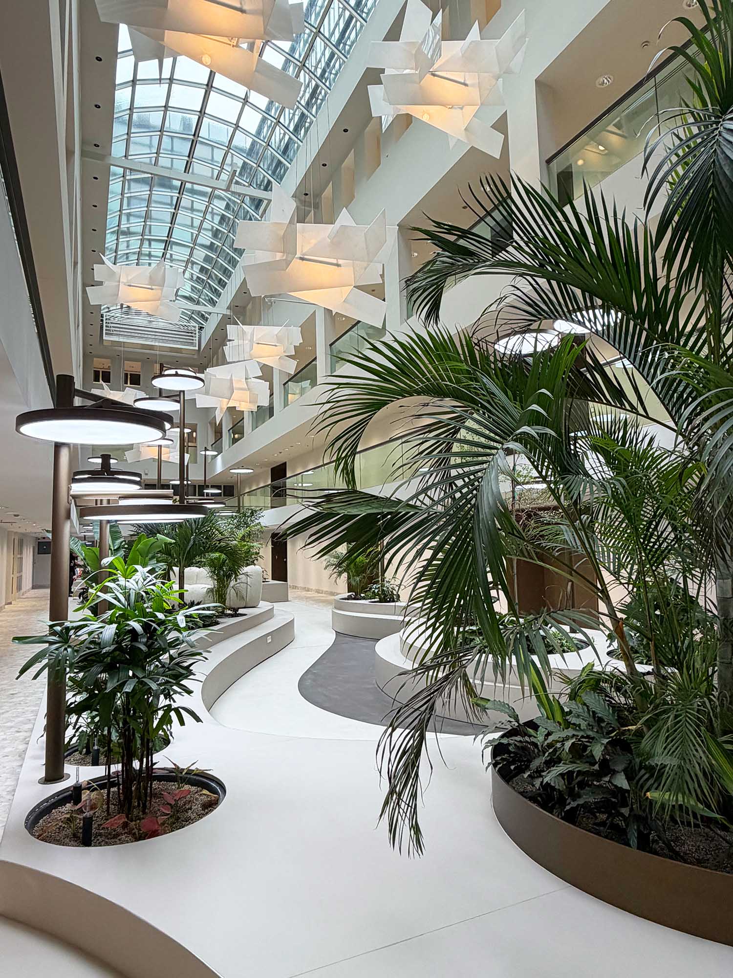 Eine grüne Oase mitten im Bürogebäude bietet einen erfrischenden Raum zum Entspannen, Plaudern und Zusammenarbeiten.