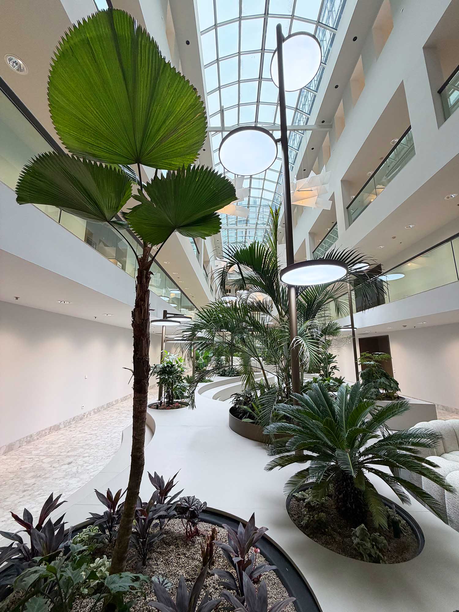 Verwendete Pflanzen: Caryota mitis, Bucida buceras, Licuala grandis, Veitchia merrillii, Rhapis multifida, Strelitzia nicolai, Cycas revoluta, Dypsis (Areca) lutescens, Philodendron xanadu, Aglaonema, Cordyline fruticosa, Spathiphyllum, Begonia, Asparagus setaceus, Chlorophytum comosum etc.